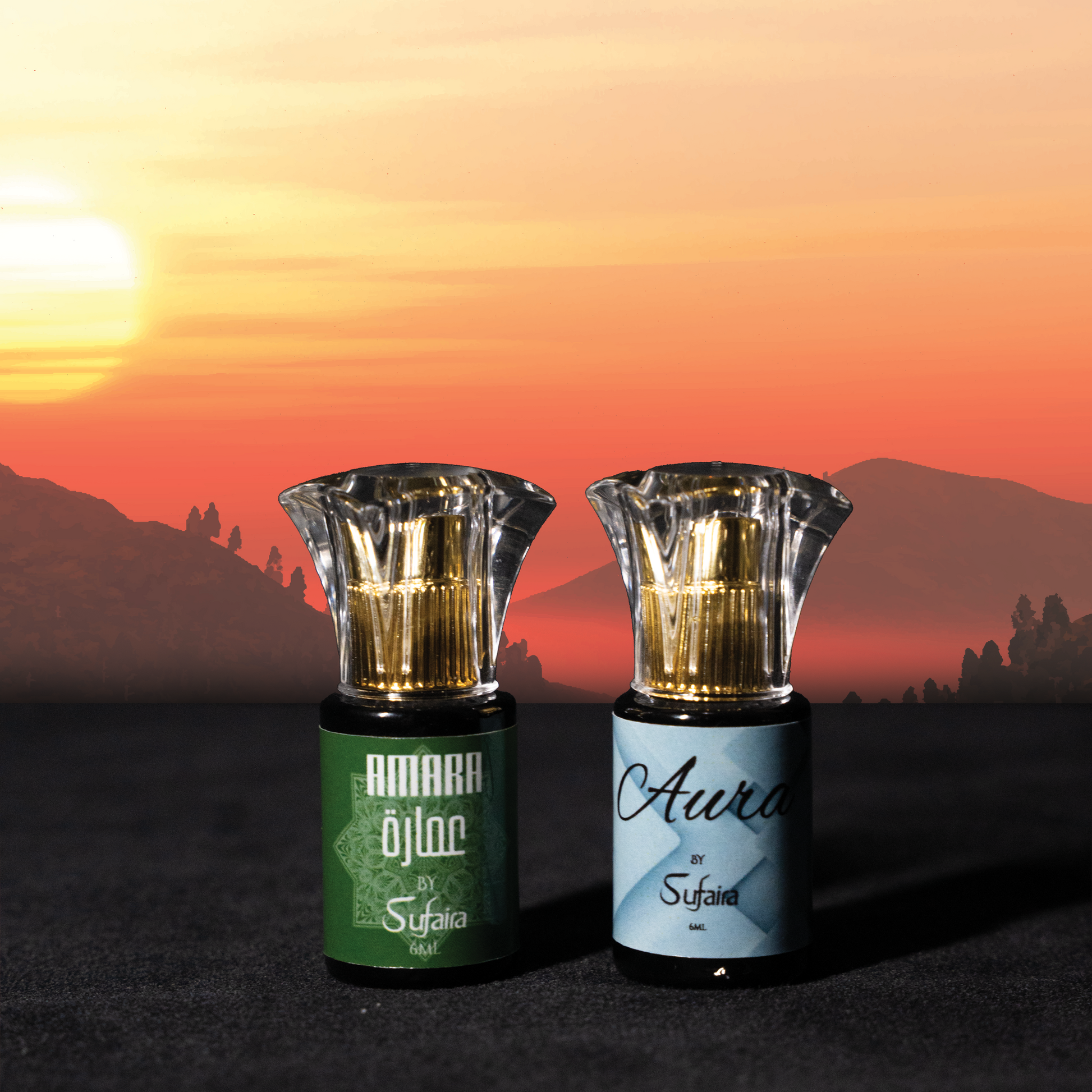 This graceful duo features Sufaira’s most delicate attars — Aura, with sweet sandalwood and creamy vanilla, and Amara, a floral-citrus blend softened by pear blossom and gourmand warmth. Together, they create a soothing, radiant experience — ideal for daily wear, gifting, or elevating quiet rituals.